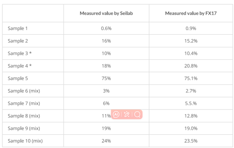 芬蘭食品工業公司Atria為本研究提供了五份碎肉樣本。我們將五份原始樣本混合,從而獲得了五份額外的樣本,將十份樣本納入分析。為了了解樣本的精確脂肪含量,Specim 要求第三方實驗室Seilab進行測量。根據 Gerber 方法,他們使用丁酸計進行脂肪分析,并獲得了認證(芬蘭 Sein?joki 的 Seilab;方法 NMKL 181,2005;見下表 1)。