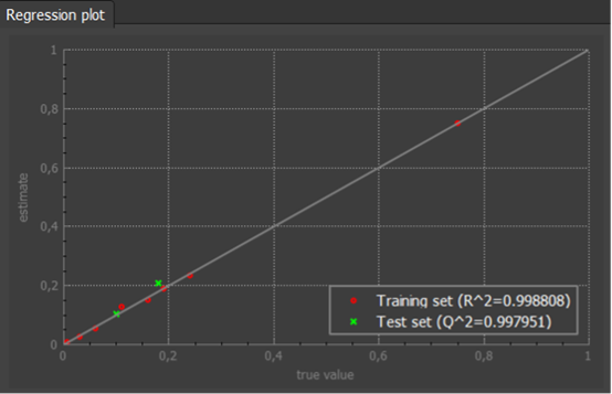 圖 2:脂肪含量預測定量模型的回歸圖。紅點代表校準樣本,綠點代表驗證樣本。
