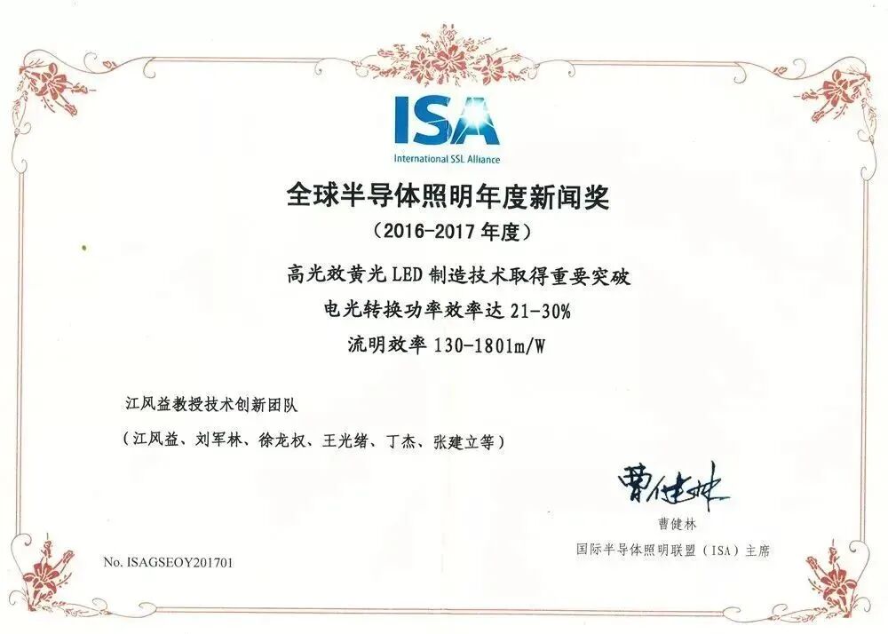 2016 年,國家硅基LED工程技術(shù)研究中心攻克“黃光鴻溝”的世界難題,硅基黃光 LED 光效突破(電光轉(zhuǎn)換效率24.3%),遠(yuǎn)超國際研發(fā)水平(電光轉(zhuǎn)換效率 9.63%),該新聞事件入選“全球半導(dǎo)體照明年度新聞獎(2016-2017年度)”。