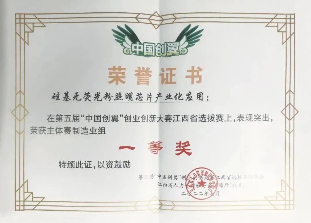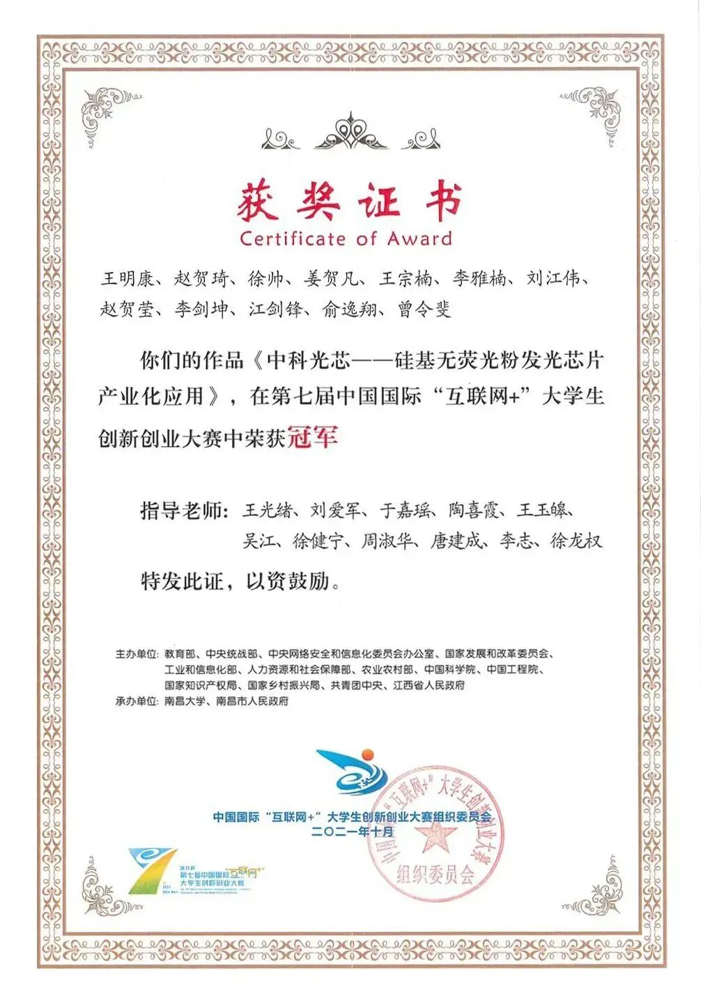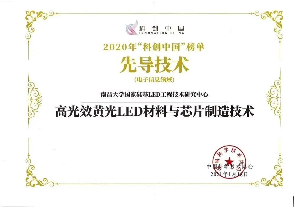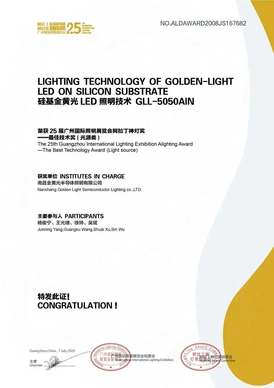 2020年10月10日,“硅基金黃光LED照明技術(shù)項目”榮獲2020阿拉丁神燈“最佳技術(shù)獎”。