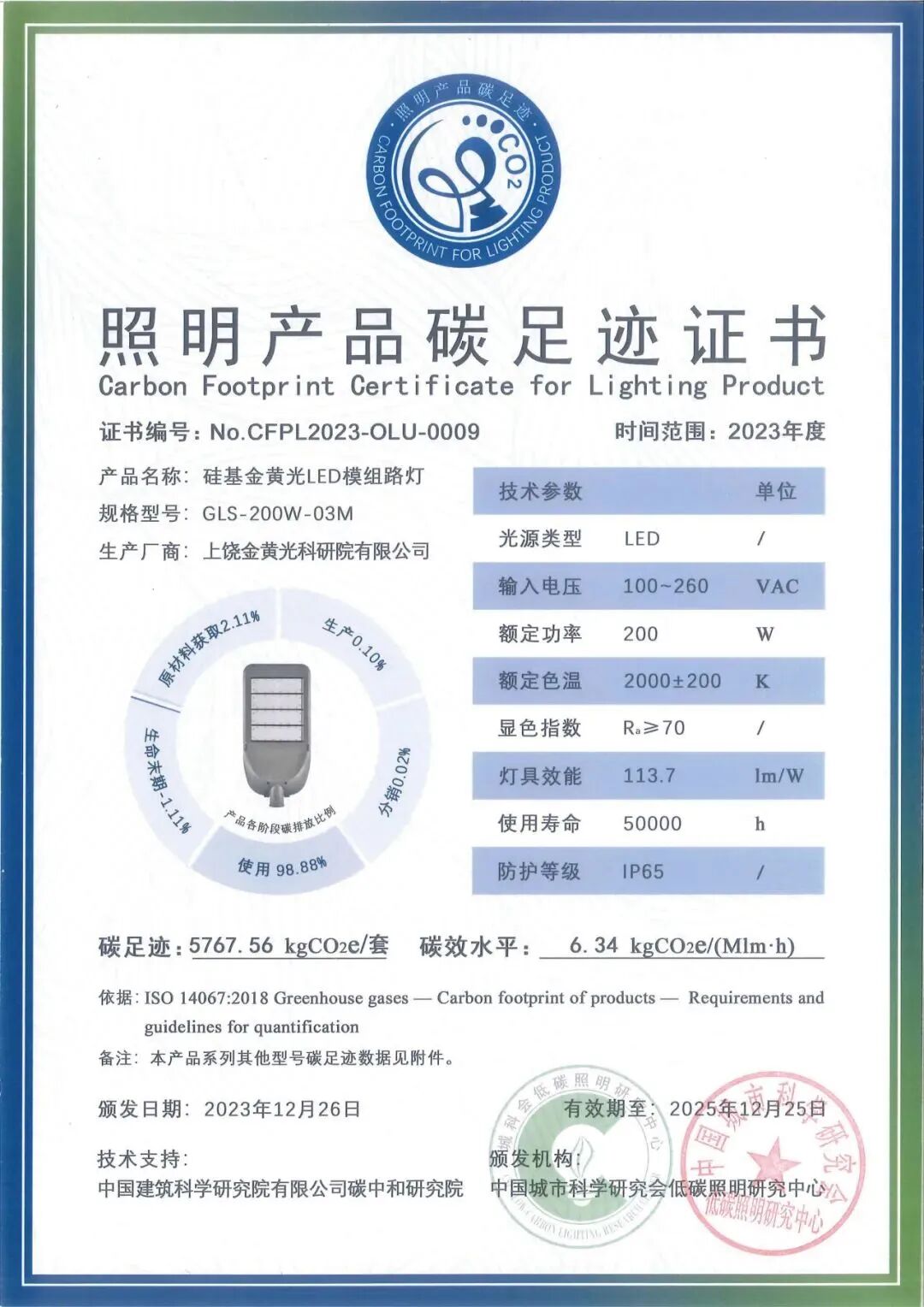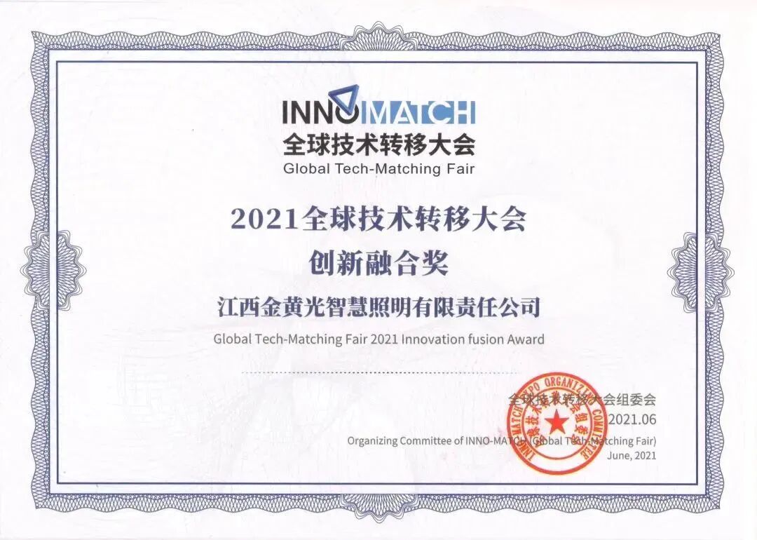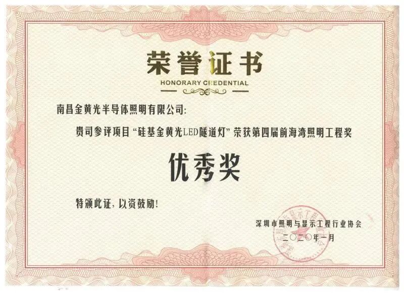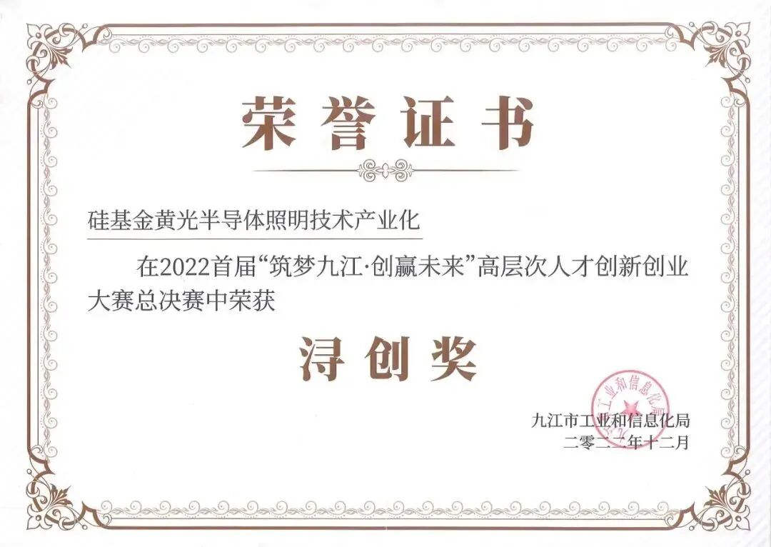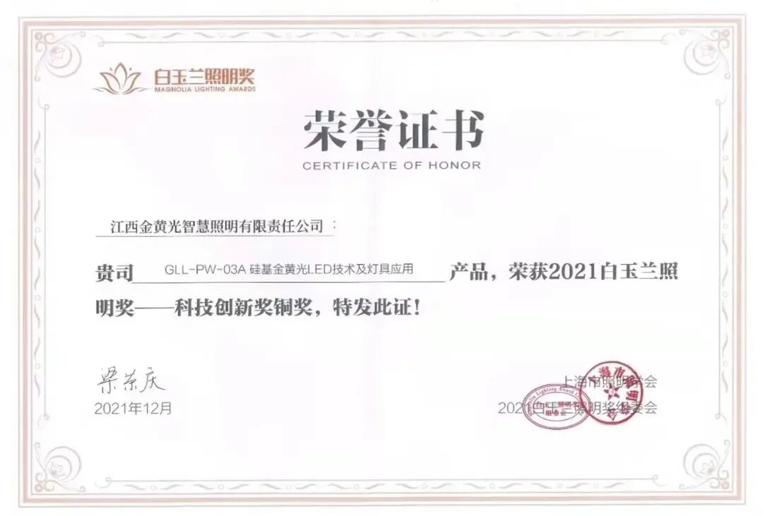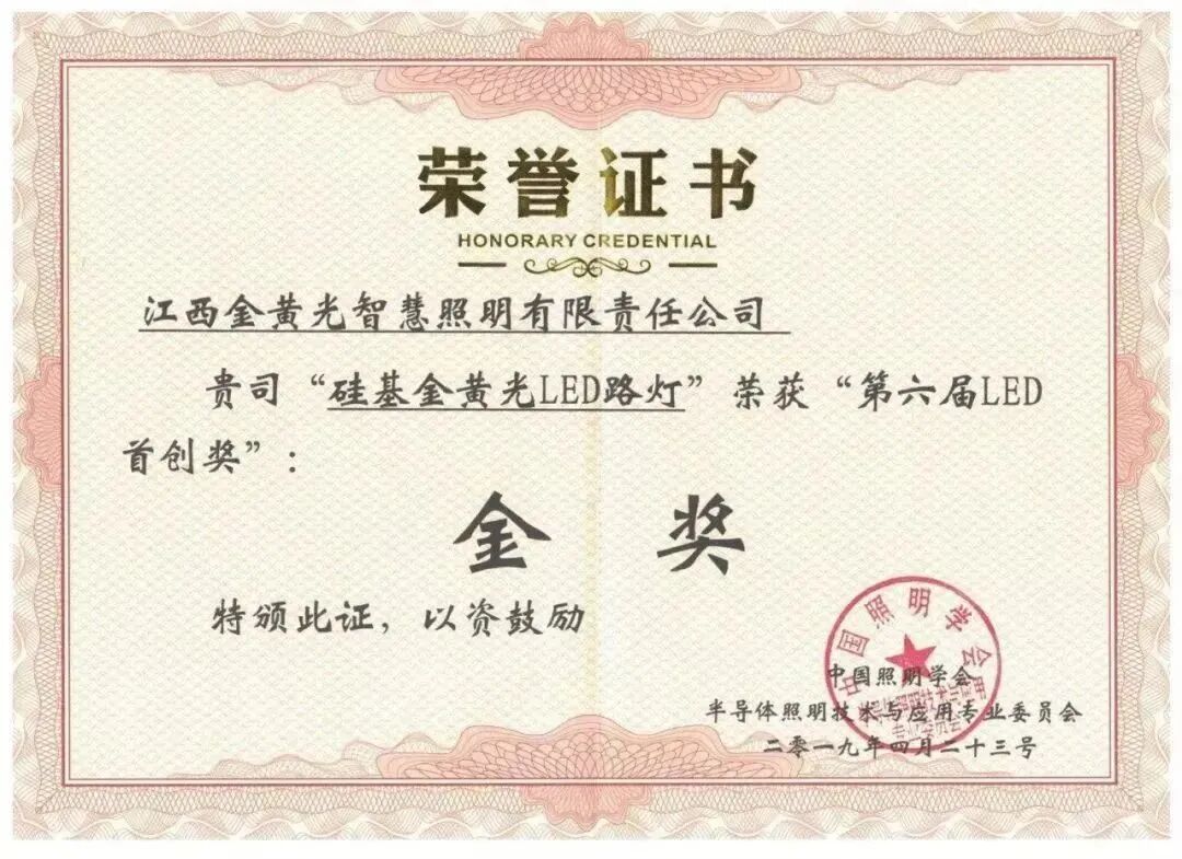 2019年4月,硅基金黃光LED路燈榮獲“第六屆中國LED首創(chuàng)獎金獎”。