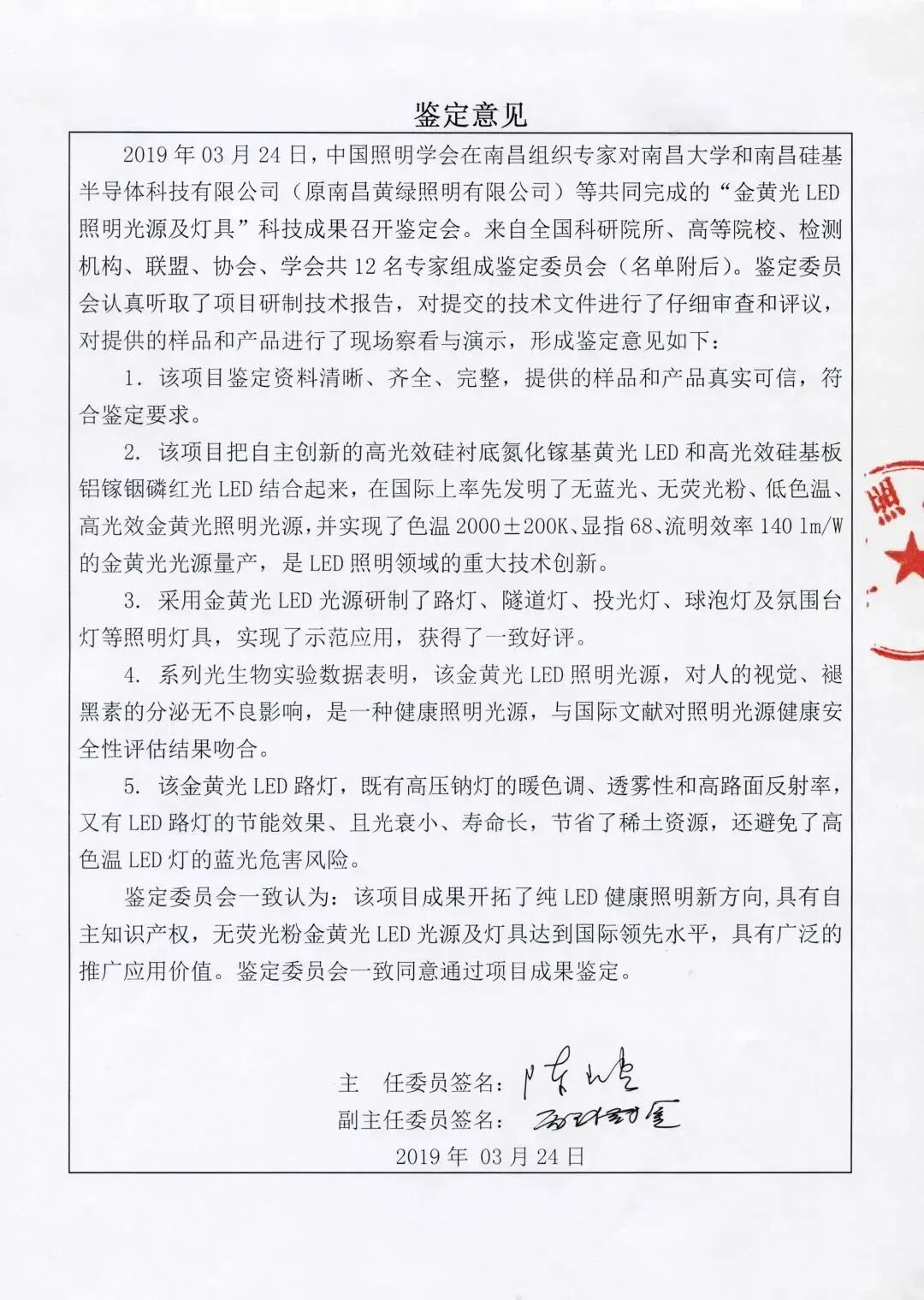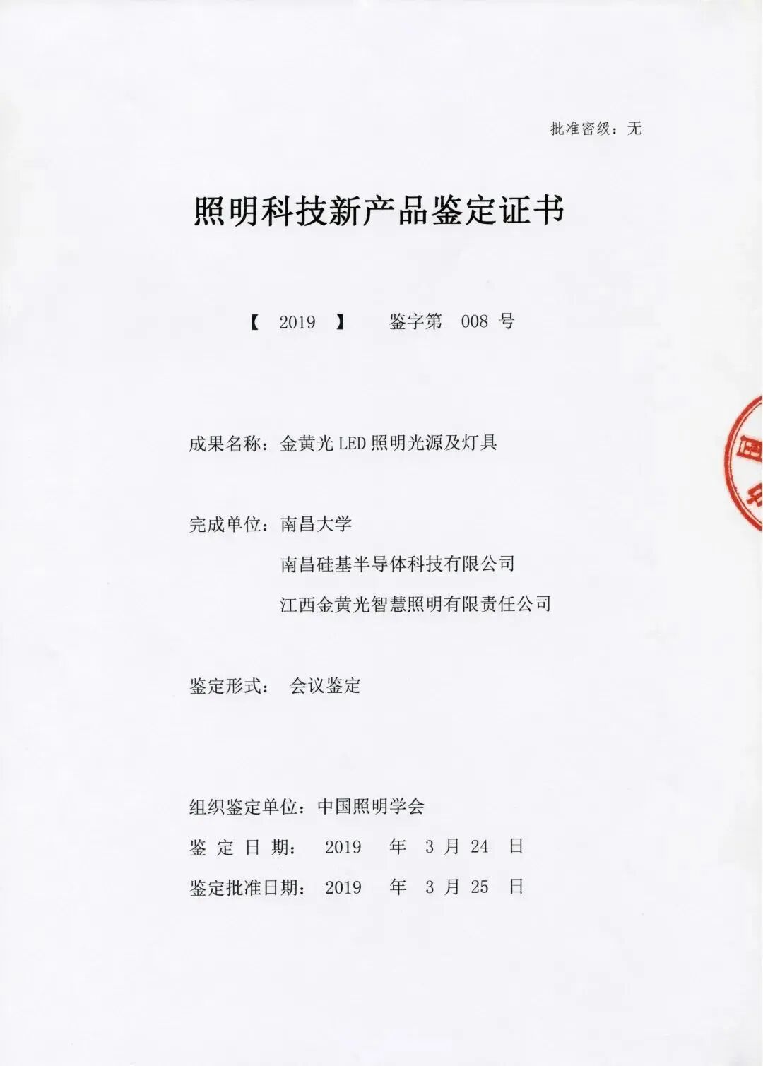 2019年3月,“硅基金黃光LED光源及燈具”項目成果,通過由中國照明學(xué)會組織的鑒定會專家組權(quán)威鑒定,鑒定結(jié)果為“國際領(lǐng)先”,開拓了純LED健康照明新方向,具有自主知識產(chǎn)權(quán),具有廣泛的推廣應(yīng)用價值。