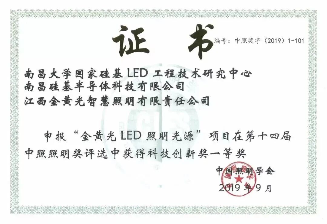 2019年9月,金黃光LED照明光源憑借國際領(lǐng)先的科研實力脫穎而出,榮獲“中照照明科技創(chuàng)新獎一等獎”。