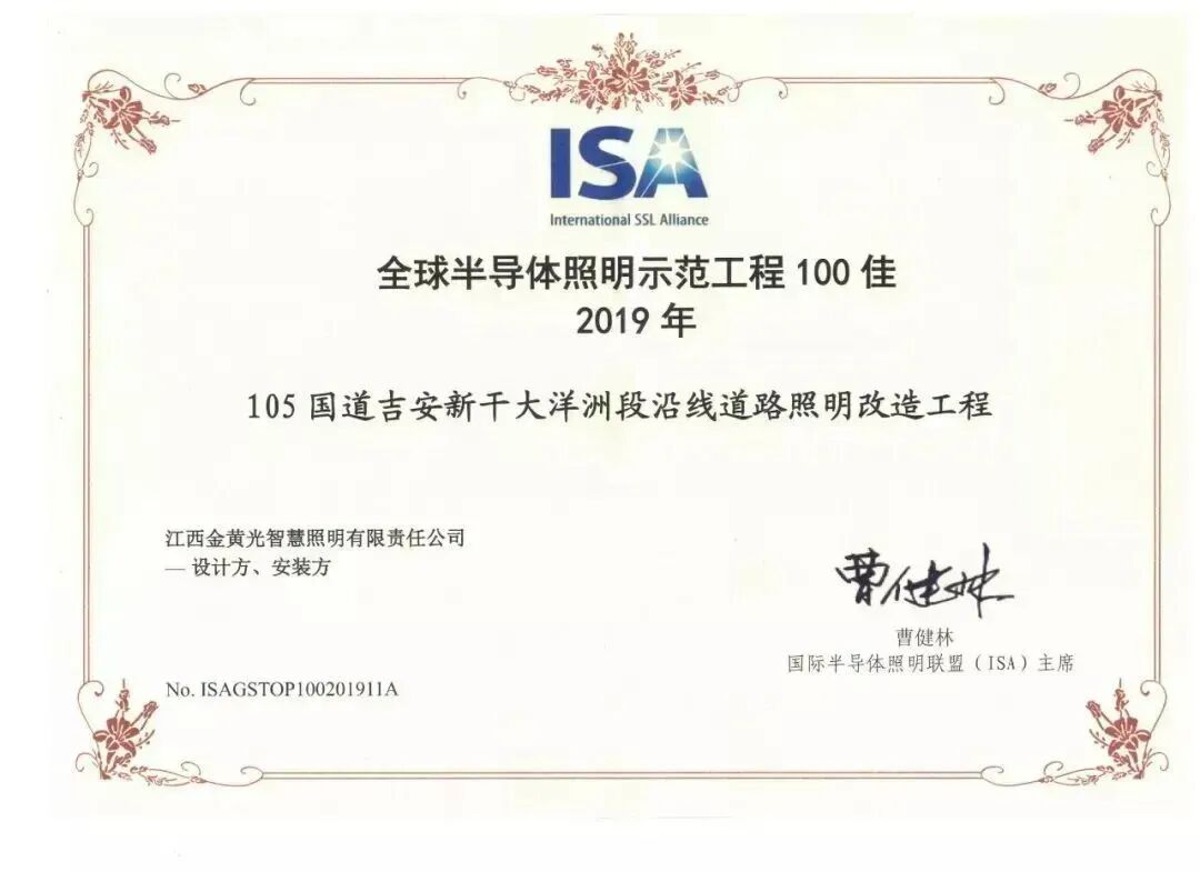 2019年11月,105國道吉安新干大洋洲段沿線道路照明改造工程榮獲“ISA 2019年全球半導(dǎo)體照明示范工程100佳”。