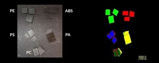 圖 3. 每個(gè)相機(jī)的分類結(jié)果;綠色:PE;紅色:ABS;藍(lán)色 PVC;黃色:PS;白色:PA;海綠色:PP;青色:PC 和紫色;PET。