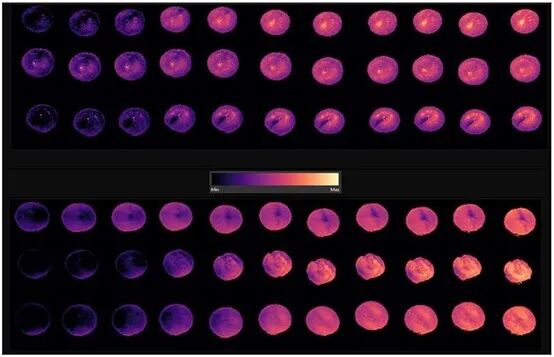 圖 4:三顆李子(頂部)和三顆西紅柿(底部)的回歸模型輸出。數據分別在第 1、2、3、6、9、13、14、16、17 和 20 天采集(從左到右)。熱圖范圍從第 1 天(最小值)到第 25 天(最大值)。