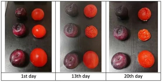 拍攝了樣品的照片,并附上了高光譜數據。圖片顯示,李子,尤其是西紅柿的新鮮度隨著時間的推移而大幅下降(圖 2)。在一個西紅柿和李子的中間做了一個小切口。這似乎對加速西紅柿的衰老產生了重大影響,但對李子卻沒有影響。