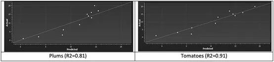 對于李子,R2 為 0.81,而對于西紅柿,R2 為 0.91。這些是根據用于訓練模型的其他選擇計算的。圖 4 顯示了實際值與預測值的回歸圖。