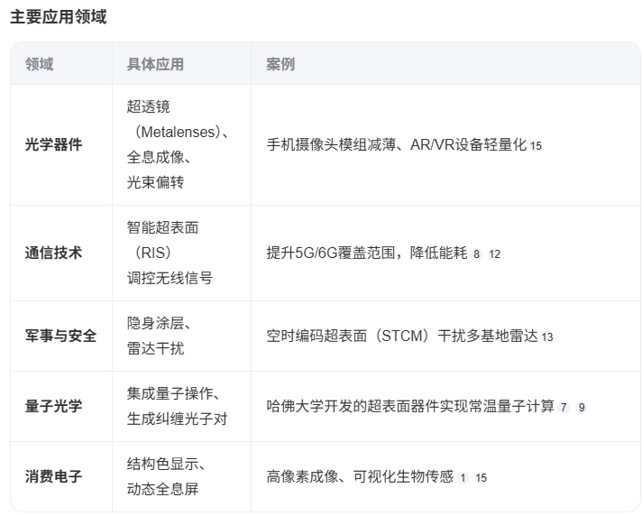超表面是一種厚度小于波長的人工層狀材料,由亞波長尺寸的微納結構(如納米天線)組成,能夠對電磁波(包括光波)的?偏振、振幅、相位、極化方式?等特性進行靈活調控。它是超材料(Metamaterial)的二維對應形式,具有更薄的厚度和更簡單的平面結構,克服了傳統(tǒng)三維超材料加工難度大的問題。根據調控的波的類型,超表面可分為?光學超表面?(最常見)、聲學超表面和機械超表面等