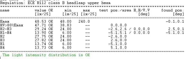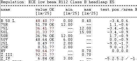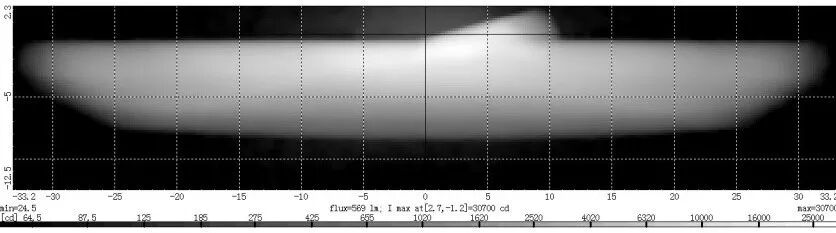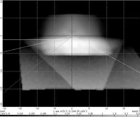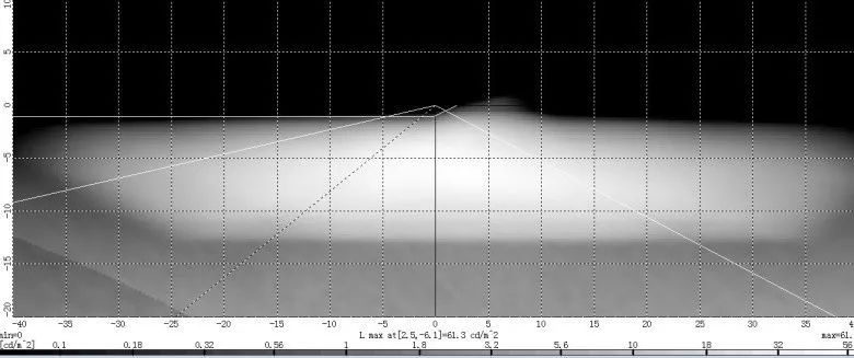 從上表可以看出,即使剛剛滿足法規(guī)要求的遠(yuǎn)光燈,其B50L(相當(dāng)于50m處對(duì)面車輛駕駛員的位置)超標(biāo)65倍,HV點(diǎn)超標(biāo)69倍,50L點(diǎn)超標(biāo)1.1倍,70L點(diǎn)超標(biāo)1.6倍。通常情況下,遠(yuǎn)光燈都會(huì)高于法規(guī)要求, 按照某整車廠的要求,B50L(相當(dāng)于50m處對(duì)面車輛駕駛員的位置)超標(biāo)121倍,HV 點(diǎn)超標(biāo)129倍:50L點(diǎn)超標(biāo)2倍,70L點(diǎn)超標(biāo)3倍。
