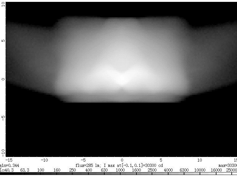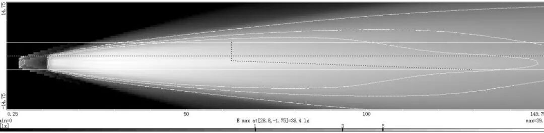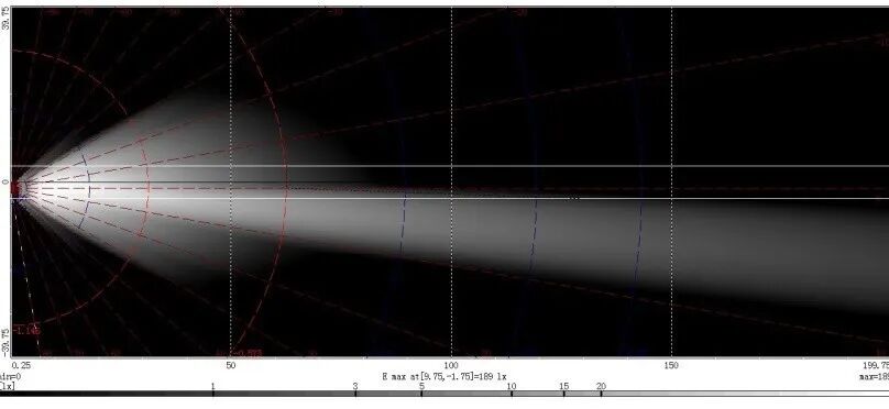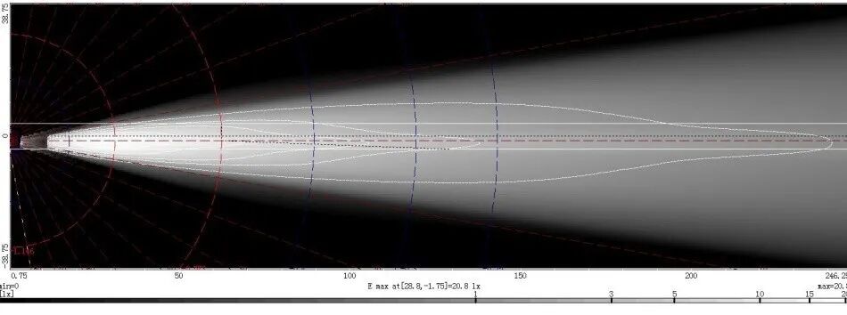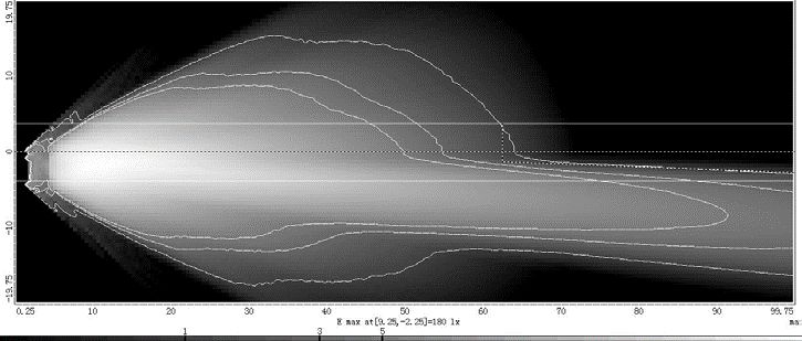 從路面的效果圖中不難看出,一個(gè)標(biāo)準(zhǔn)遠(yuǎn)光燈,在本車道上1lx線可以達(dá)到250m左右,5 lx線可以達(dá)到150m左右,具有良好的照明效果。但10m以內(nèi)的照明效果不好,而且照射角度較小,左右寬度僅為10度左右,50m以內(nèi)的左右兩側(cè)的照明不足,適合高速行駛時(shí)的遠(yuǎn)程照明。由于遠(yuǎn)光燈是錐型的照射角,沒(méi)有截止線,上射的光線很強(qiáng),在霧氣中容易使光線發(fā)生較大的散射,會(huì)在車前形成很強(qiáng)的光幕,穿透力反而最差:霧越濃,燈光越強(qiáng),形成的光幕越強(qiáng),道路的可視距離則越短。