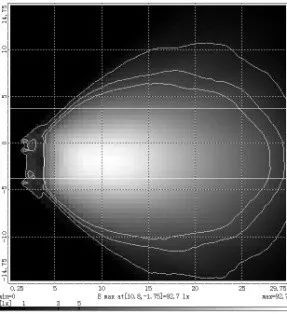 從路面的效果圖中不難看出,一個(gè)標(biāo)準(zhǔn)前霧燈,在本車道上1lx線可以達(dá)到30m左右,5lx線可以達(dá)到27m左右,10m以內(nèi)具有良好的照明效果,且照射角度可以達(dá)到左右40度以上。對(duì)兩側(cè)有良好的照明效果,非常有利于近距離的照明。霧燈的下射角度較大,在垂直方向的立體角很窄,在霧氣中的散射光線較少,不容易產(chǎn)生光幕;在霧、雪、雨或塵埃中的穿透能力強(qiáng),在惡劣條件下具有較遠(yuǎn)的道路距離。